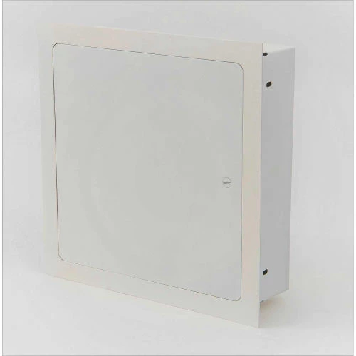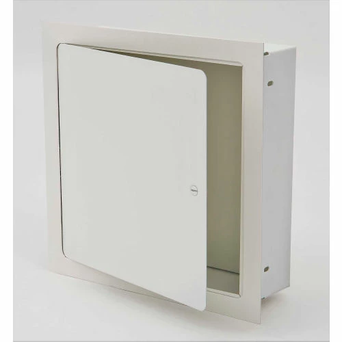 Access door and frame is fabricated from 16-gage, galvannealed steel with a prime coat finish suitable for painting. The door has rounded safety corners and a concealed continuous piano hinge. Frame is one-piece construction with no miters or welds on the face. Latch is screwdriver operated. Box is fully enclosed.